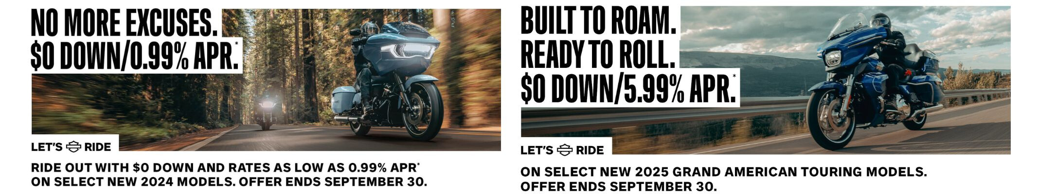 *Financing Offer available only on select, untitled 2023 and 2024 Harley-Davidson® motorcycles financed through Eaglemark Savings Bank and is subject to credit approval. Harley-Davidson® Icons Motorcycle Collection are excluded. Not all applicants will qualify as the Annual Percentage Rate (APR) will vary based on the applicant’s past credit performance and the term of the loan. Financing offer is available only for up to a 36-month term. For example, a 2024 Road Glide® motorcycle in Sharkskin Blue with Black Trim and an MSRP of $28,199, no down payment and amount financed of $28,199, 36-month repayment term, and 0.99% APR results in monthly payments of $795.32. In this example, customer is responsible for applicable taxes, title, licensing fees and any other fees or charges at the time of sale. APR is calculated according to the simple interest method. Not valid in conjunction with other offers. Customer must take delivery by September 30, 2025. This Financing Offer is valid during the period of July 1, 2025 to September 30, 2025. Other terms, conditions, and limitations may apply. Dealer participation may vary. Financing offer is subject to change or cancellation at anytime. See dealer for details.