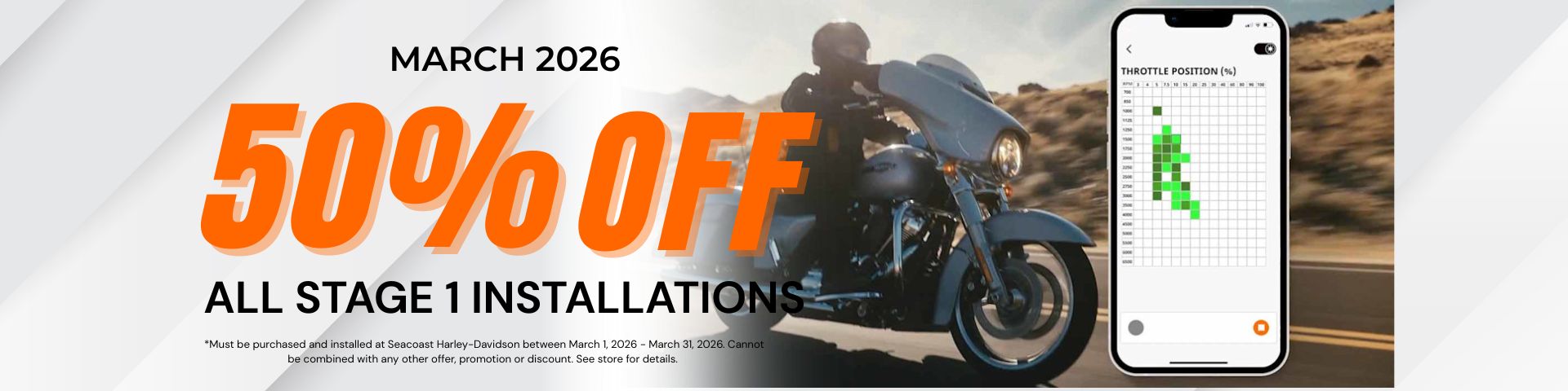 *Must be purchased and installed at Seacoast Harley-Davidson between March 1, 2026 - March 31, 2026. Cannot be combined with any other offer, promotion or discount. See store for details.